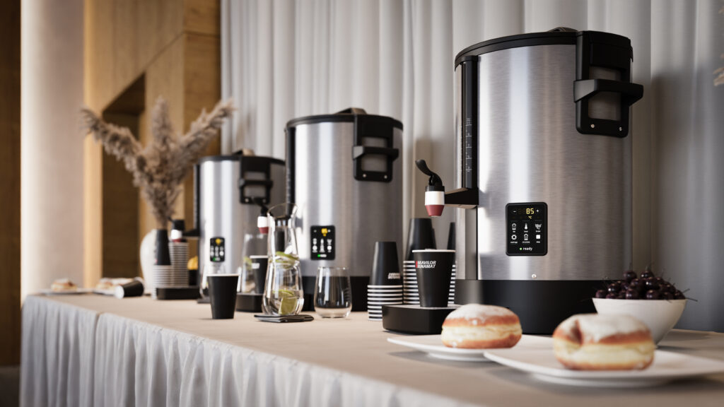 Le réservoir d’eau est rempli et chauffé soit à une température de préchauffage prédéfinie, soit directement à la température d’infusion souhaitée. Le chauffage d’un volume complet de 10 litres prend environ 23 minutes.